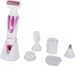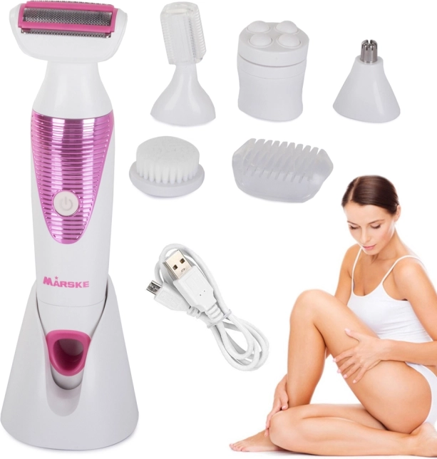 Geniet zonder moeite van een gladde huid. De multifunctionele dames epilator 5-in-1 combineert snel en pijnloos ontharen met huidverzorging. Verwisselbare opzetstukken laten je het hele lichaam verzorgen – van het scheren van de benen en het trimmen van gevoelige zones tot epilatie van de wenkbrauwen of het verwijderen van haartjes in neus en oren. Het reinigingsborsteltje verdiept de huidhygiëne en de massagekop helpt spanning te verminderen.