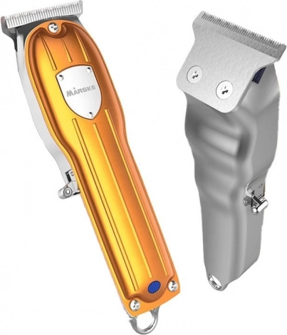 Elegante gouden MÄRSKE‑trimmer voor precieze verzorging van haar en baard. Biedt een roestvrijstalen mes, draadloze werking, snelladen via USB en 3 opzetkammen 1–3 mm voor perfect strakke lijnen en details.
