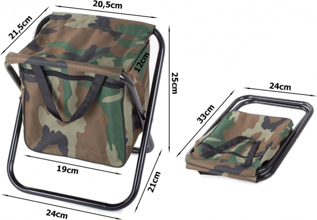 Licht en praktisch opvouwbaar krukje met geïntegreerde ritszak, ideaal voor vissen, kamperen en de tuin. Biedt stabiel metalen frame, comfortabel zitvlak, compacte afmetingen en een aantrekkelijke camouflageprint.