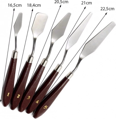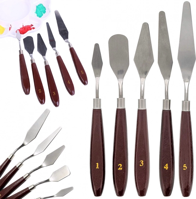 De complete set van vijf paletmessen dekt het mengen op het palet, het aanbrengen van dikkere verflagen en het creëren van reliëfeffecten en nauwkeurige randen.