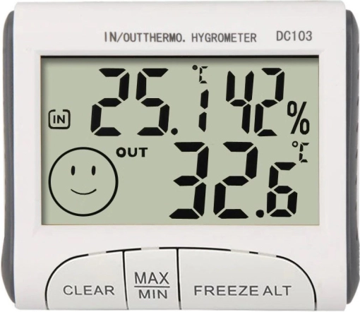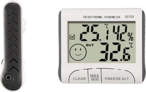 Behoud het ideale klimaat thuis en op het werk. Deze digitale thermometer en hygrometer toont de actuele temperatuur en luchtvochtigheid binnen en via de duurzame externe sonde ook de temperatuur buiten. Het duidelijke LCD-scherm wordt aangevuld met een grafische smiley die direct laat zien of de omstandigheden comfortabel zijn.