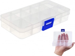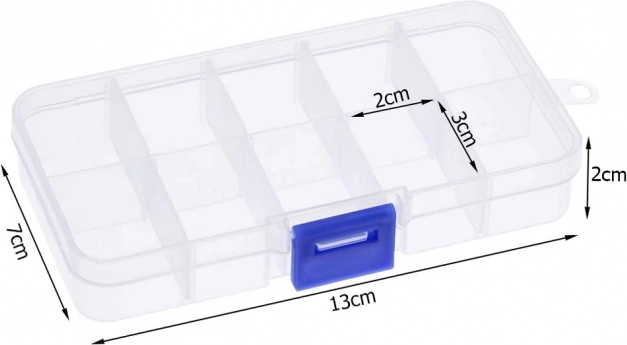 Universele opbergbox met uitneembare vakverdelers, ideaal voor het sorteren van kleine items in huis, werkplaats en onderweg. Dankzij de compacte afmetingen van 13 × 7 × 2 cm past hij in een handtas of rugzak en de ophangopening maakt plaatsing aan de muur binnen handbereik eenvoudig.