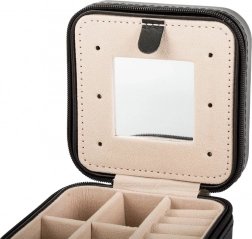 Deze stijlvolle sieradendoos met zwarte buitenkant en beige fluwelen interieur is ideaal voor dagelijks gebruik én voor op reis. De overzichtelijke indeling biedt ruimte voor ringen, oorbellen, kettingen en kleine accessoires, terwijl het geïntegreerde spiegeltje helpt je look snel bij te werken.