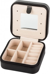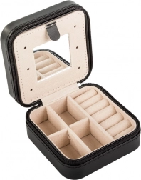 De sieradendoos van 10 × 10 × 5 cm past in elke tas en biedt dankzij de slimme indeling plek voor ringen, oorbellen en kettinkjes.