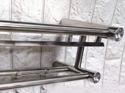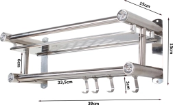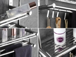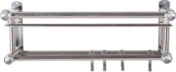 Deze wandgemonteerde badkamerplank biedt een slimme oplossing voor ruimtebesparing en orde in de douche of bij de wastafel. Het bovenste oppervlak biedt plek voor cosmetica en kleinigheden, terwijl het onderste deel een dubbele handdoekstang en vier haken voor accessoires heeft. Het minimalistische ontwerp in zilver oogt strak en elegant.