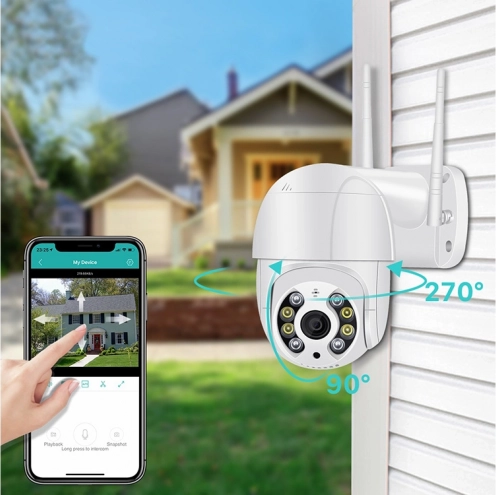 De buitenshuis WiFi-camera is voorzien van opnamehoeken tot 270 graden horizontaal en 90 graden verticaal, wat zorgt voor een breed dekkingsgebied. Dankzij de nachtmodus met infrarood- en LED-lampen zijn de beelden ook bij volledige duisternis gedetailleerd.