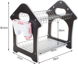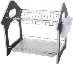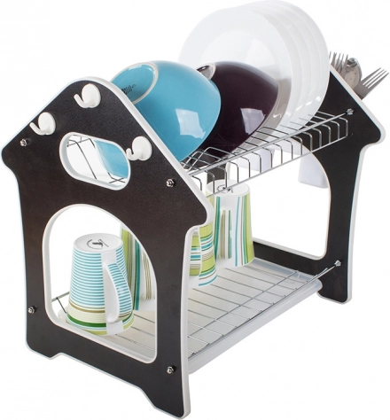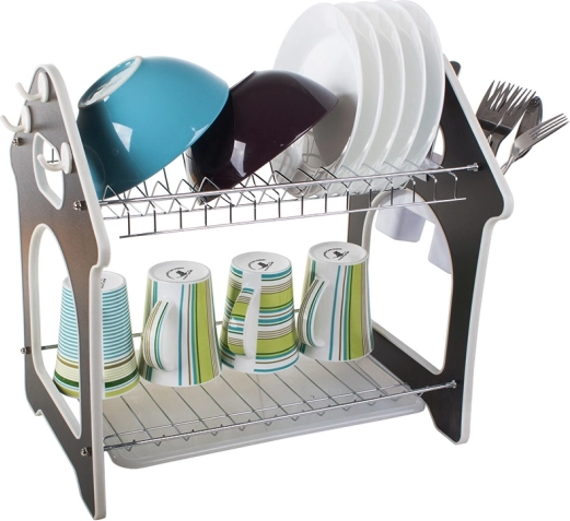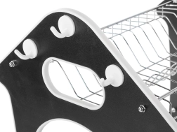 Dit tweelaagse afdruiprek benut de verticale ruimte optimaal en biedt plaats aan tot 14 borden op de bovenste plank, terwijl de onderste plank ideaal is voor kommen, mokken en glazen. Inclusief een afneembare bestekhouder die aan elke zijde geplaatst kan worden en drie haken voor het ophangen van keukengerei.