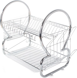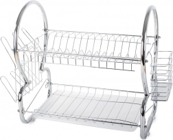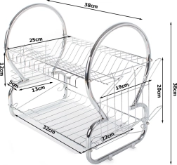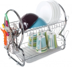 Houd het aanrecht netjes met dit afdruiprek met twee niveaus, dat op het bovenste niveau plaats biedt aan tot 14 borden en op de onderste plank ruimte biedt voor kommen, mokken en glazen. Het zijaccessoire bestaat uit een uitneembare bestekmand en een houder voor tot 6 glazen. De onderste kunststof lekbak vangt het water betrouwbaar op.