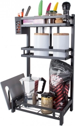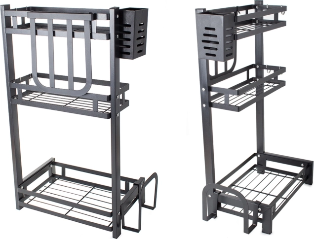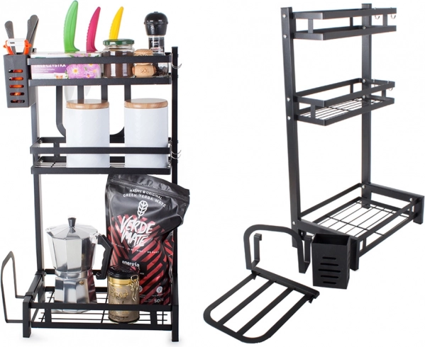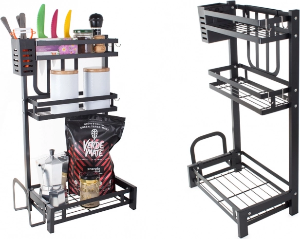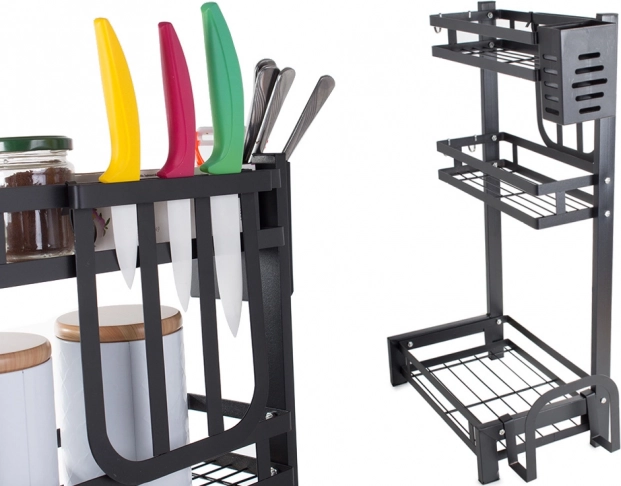 De metalen keukenorganizer met drie niveaus is een onmisbaar hulpmiddel voor een efficiënte indeling van de keuken. Gemaakt van hoogwaardig metaal met poedercoating, is het product bestand tegen beschadigingen en vocht. De stabiele constructie maakt het mogelijk om ook zwaardere voorwerpen op de organizer te plaatsen.