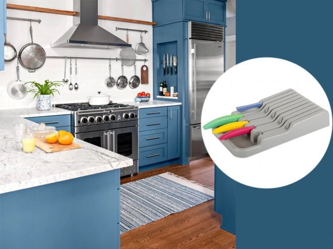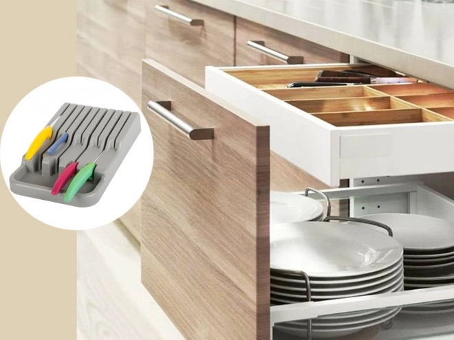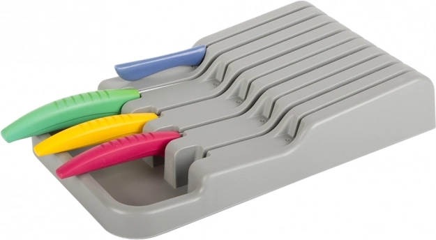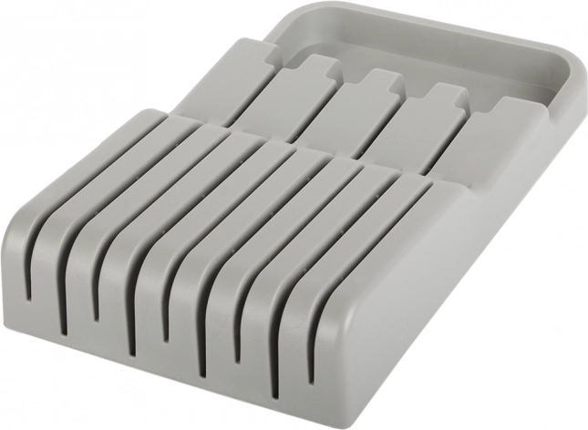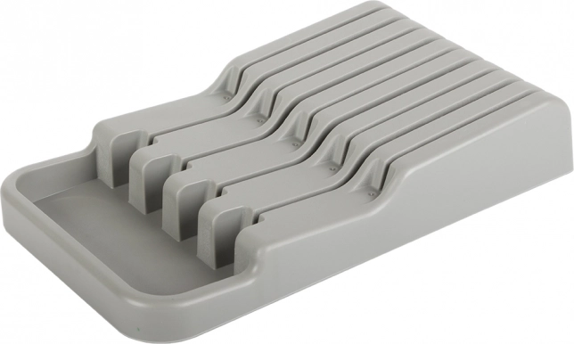 De messenhouder voor in de lade is een uitstekende keuze voor zowel moderne als traditionele keukens. Gemaakt van duurzaam plastic in een elegante grijze kleur, wat zorgt voor een lange levensduur. Dankzij de compacte afmetingen past hij gemakkelijk in elke standaard keukenlade, waardoor de ruimte optimaal wordt benut.