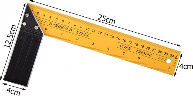 De stalen winkelhaak is een onmisbaar hulpmiddel voor bouw, renovatie en timmerwerk. Hij meet nauwkeurige rechte hoeken en biedt metingen in centimeters en inches dankzij de schaalverdelingen aan beide zijden.