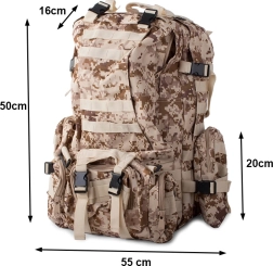 De rugzak is ontworpen voor verschillende fysieke activiteiten zoals wandelen, militaire doeleinden, kamperen en meer. Het ergonomische ontwerp met verstelbare riemen en gewatteerde schouderbanden zorgt voor comfort, zelfs tijdens lange tochten.