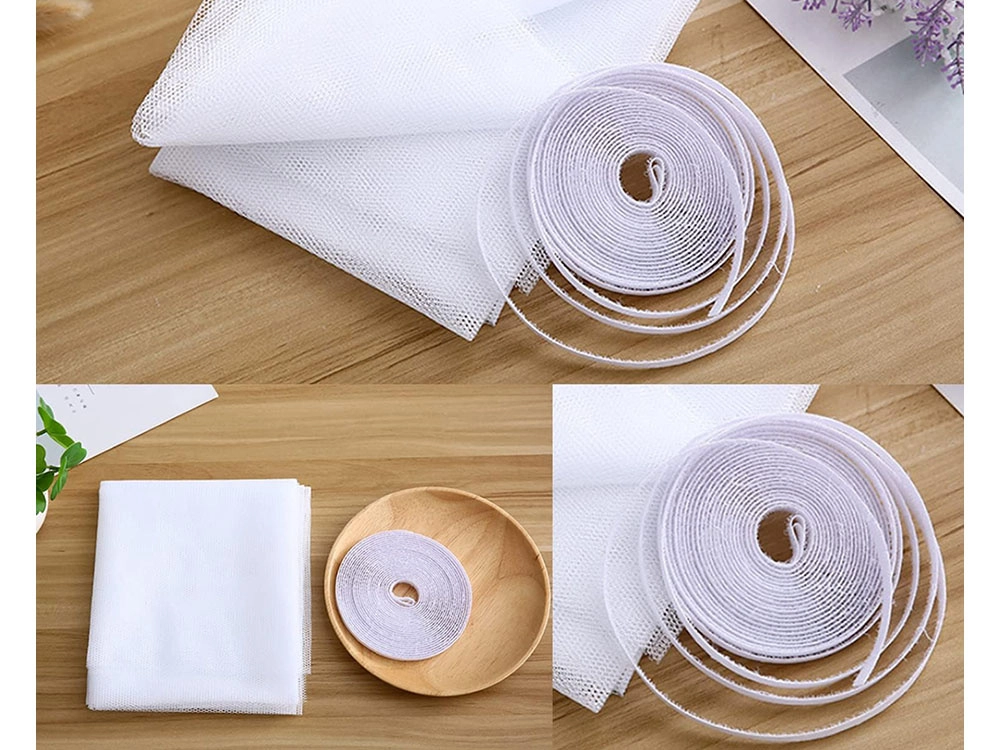 De installatie duurt slechts enkele minuten: plak het klittenband op het kozijn, breng het gaas aan, knip de randen bij en je bent klaar. Het materiaal is duurzaam, wasbaar (30 °C) en geschikt voor herhaald gebruik. De afmeting 180 × 150 cm kan eenvoudig op maat worden gemaakt voor de meeste ramen en balkondeuren.
