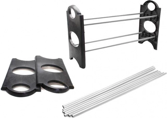De segmentconstructie combineert metalen (chroomkleurige) buizen met duurzame kunststof staanders. In elke buis zitten drie montagegaten, zodat u de hoogte van de planken eenvoudig kunt aanpassen voor zowel pumps als sneakers. Het rek is uit te breiden met extra niveaus – door twee sets te koppelen verdubbelt u de capaciteit. De montage gaat snel en bij demontage neemt het minimaal ruimte in.