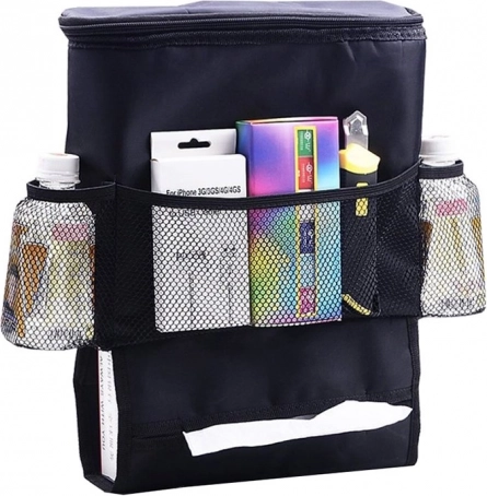 Houd het interieur van de auto perfect netjes met deze praktische organizer voor de achterkant van de stoel met geïntegreerde thermotas. Biedt een grote geïsoleerde vak met ritssluiting om drankjes en eten op de optimale temperatuur te houden, 3 gaasvakken voor kleine spullen en flessen en een ondervak voor tissues. Eenvoudig te monteren, hecht goed aan de stoel en beschermt tegelijk de rugleuning tegen vuil.