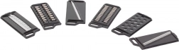 De set bevat zes verschillende messen voor alle soorten snijden, inclusief dunne en dikke reepjes, plakjes en een gegolfd ontwerp.