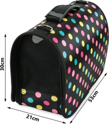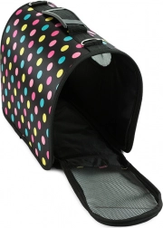 Deze draagtas voor huisdieren is ontworpen met oog voor veiligheid en comfort. Het elegante ontwerp met gekleurde stippen op een zwarte achtergrond geeft de tas een moderne uitstraling. Hij is voorzien van twee grote ventilatieroosters en een raampje voor voldoende luchttoevoer.