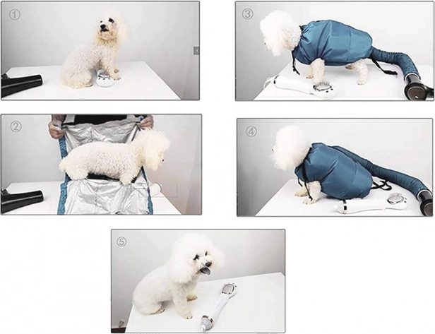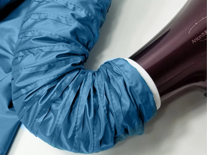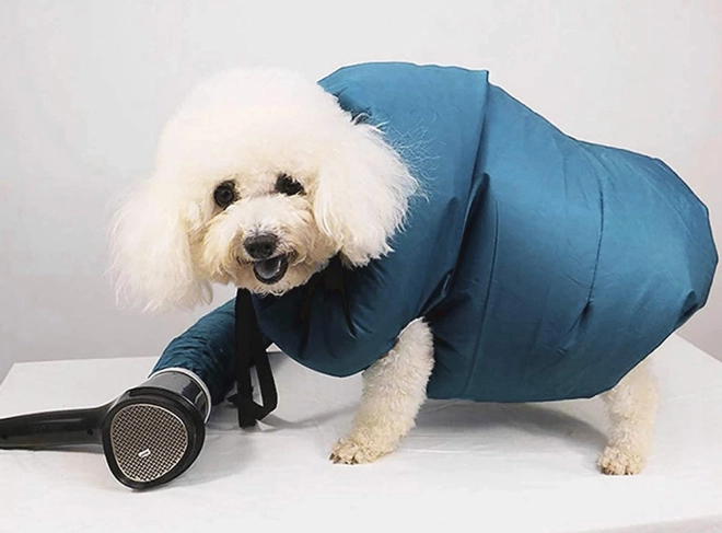 De nauwsluitende jas met toevoer van warme lucht uit de föhn verkort de droogtijd en minimaliseert rommel in huis.