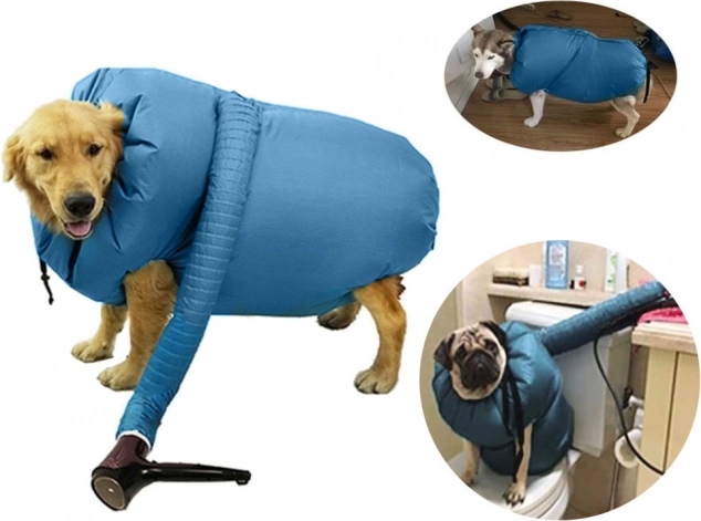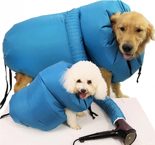 Geen gedoe meer met handdoeken en natte pootafdrukken in huis. De droogjas voor honden van waterafstotende stof omsluit het lichaam van het dier en zorgt dankzij de toevoer van warme lucht uit de föhn voor snel, efficiënt en veilig drogen na het bad, zwemmen of regen. Verstelbare aansnoerkoorden en klittenbandsluitingen helpen de pasvorm aan te passen aan verschillende hondenmaten.