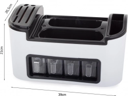 Maak de organisatie in je keuken makkelijker met deze praktische keukenorganizer. Hij biedt een meerlagige constructie die zorgt voor gemakkelijke toegang tot alle benodigde items. Op het bovenste niveau plaats je eenvoudig je favoriete kruiden, potjes of flessen. Aan de zijkanten is ruimte voor keukentools zoals messen, vorken of spatels.
