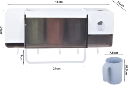De slimme badkamerorganizer combineert opbergruimte voor tandenborstels, tandpasta en cosmetica in één compact geheel. De automatische tandpastadispenser vereenvoudigt de dagelijkse hygiëne, terwijl de opbergvakken voor accessoires plaats bieden aan crèmes, make-upkwasten of deodorant. Drie duurzame kunststof bekers (300 ml) zijn ideaal voor het hele gezin.