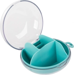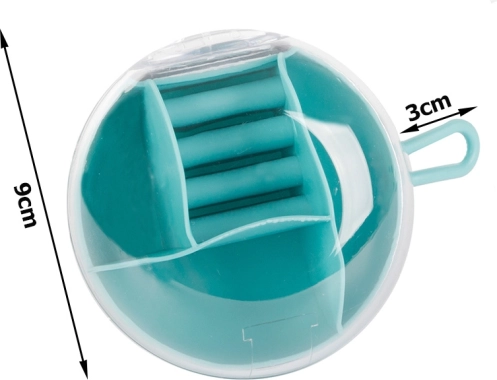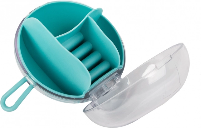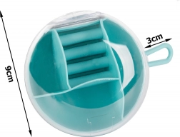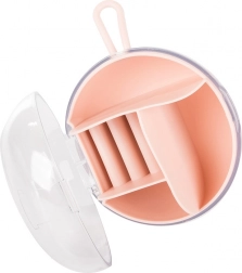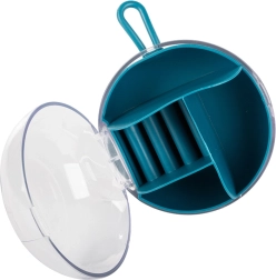 Dankzij de uitneembare centrale organizer kun je een deel van de vakken ook afzonderlijk gebruiken. De compacte afmetingen, diameter 9 cm en hoogte 6 cm, maken hem ideaal voor in je handtas, koffer en op de kaptafel. Beschikbare kleuren: roze, donkerblauw, groen.