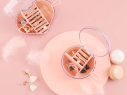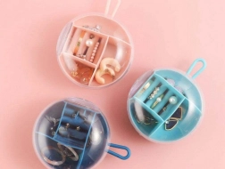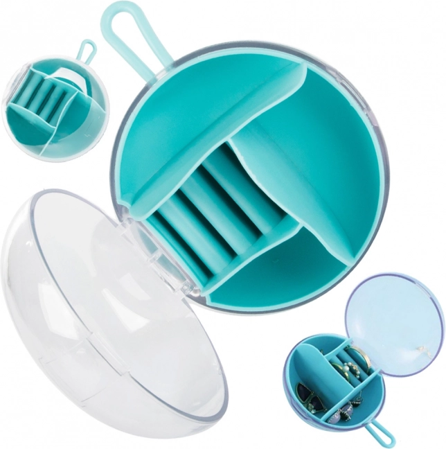 Deze elegante reissieradendoos helpt je kostbaarheden veilig en overzichtelijk te bewaren. De ronde box van duurzaam kunststof heeft verschillende typen en maten compartimenten, inclusief ringhouders, zodat elk stuk zijn eigen plek heeft. Het transparante deksel maakt een snelle controle van de inhoud mogelijk zonder te openen en de rubberen lus zorgt voor comfortabel dragen.