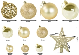 In de set vindt u ornamenten met diameters variërend van 30 mm tot 60 mm en een ster van Betlehem met de afmetingen 13,5 cm x 14 cm. Alles is verpakt in een esthetische koffer, die zorgt voor eenvoudige opslag.