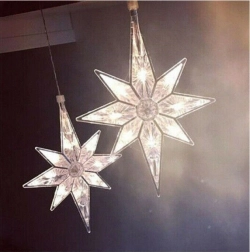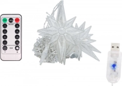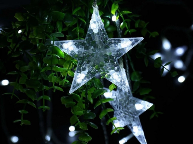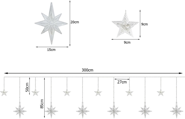 Het gordijn bevat 6 grote sterren en 6 kleinere sterren, met een totale lengte van 5 m. U kunt kiezen uit 8 verschillende lichtprogramma's om de gewenste sfeer te creëren met behulp van de meegeleverde afstandsbediening.