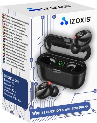 - 2× oordopje, oplaadcase/powerbank, 3 paar siliconen eartips, USB–MicroUSB-kabel