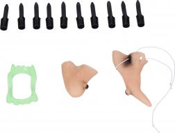 Neus met elastiek, kin met elastiek, 10 opzetvingers met nagels, tanden, heksenhoed