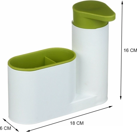 Deze stijlvolle keukenorganizer dient als een ideale oplossing voor het opbergen en doseren van vloeibare zeep of reinigingsmiddel. Eenvoudig in gebruik dankzij de gebruiksvriendelijke pomp, die zorgt voor de juiste dosering. De unit heeft ingebouwde ruimte voor borstels, sponzen of tandenborstels. Het uitneembare ontwerp maakt eenvoudig schoonmaken mogelijk.<p>