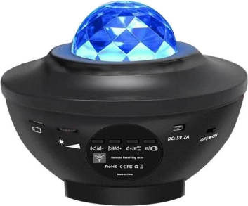 Het apparaat heeft een ingebouwde bluetooth-luidspreker (ook ondersteuning voor een USB-stick), zodat je licht eenvoudig met muziek combineert. Met de afstandsbediening schakel je modi en nummers en stel je een timer van 1–2 uur in. De projector kan vrijstaand gebruikt of aan muur/plafond worden opgehangen en staat dankzij anti-slip voetjes stabiel op meubels.