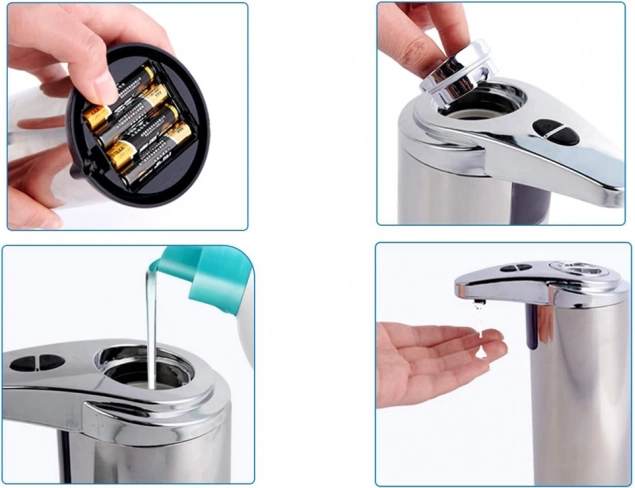 Voor gebruik kun je de aan-uit knop eenvoudig langer ingedrukt houden. De voeding wordt geleverd door vier AAA-batterijen. De dispenser is ideaal voor desinfectiemiddelen dankzij het contactloze systeem, dat de verspreiding van bacteriën minimaliseert.