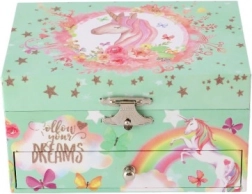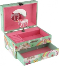 Deze stijlvolle muzikale sieradendoos met eenhoorn is ideaal voor het opbergen van ringen, oorbellen en kleine geheimen. Bij het openen van het deksel met spiegeltje en na het opwinden gaat de wit-roze eenhoorn draaien en klinkt er een zachte melodie. De binnenkant biedt een ingedeelde ruimte voor sieraden, terwijl de onderste lade extra kostbaarheden herbergt.