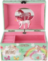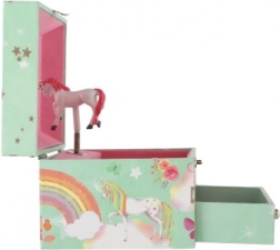Na het opwinden en openen van het deksel begint het eenhoornfiguurtje te draaien en klinkt een zachte melodie die de magische sfeer bij het opbergen van sieraden versterkt.