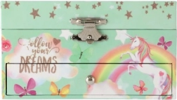 Het pastelgroene oppervlak is versierd met motieven van regenbogen, sterretjes en vlinders. De sieradendoos is gemaakt van stevig karton en voorzien van een metalen sluiting en duurzame scharnieren voor een langere levensduur. Een geweldig cadeau voor de kinderkamer – mooi om te zien en tegelijk praktisch.